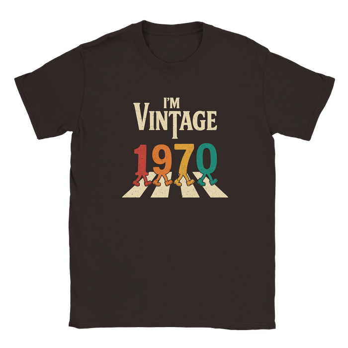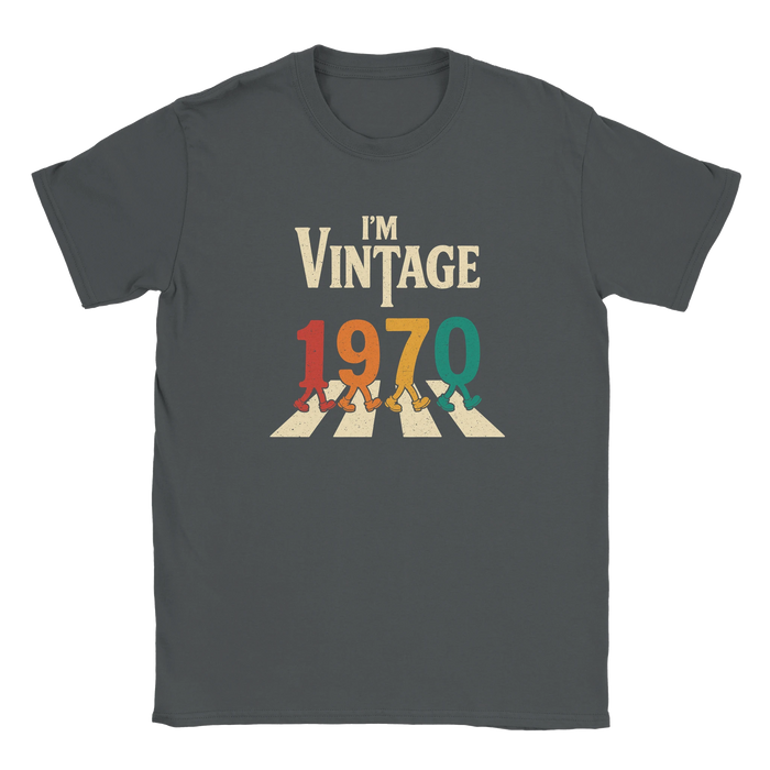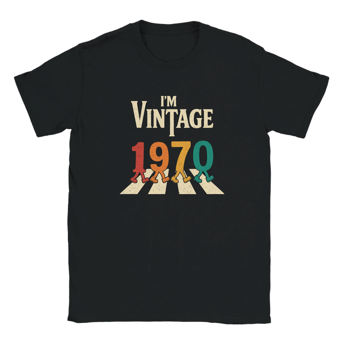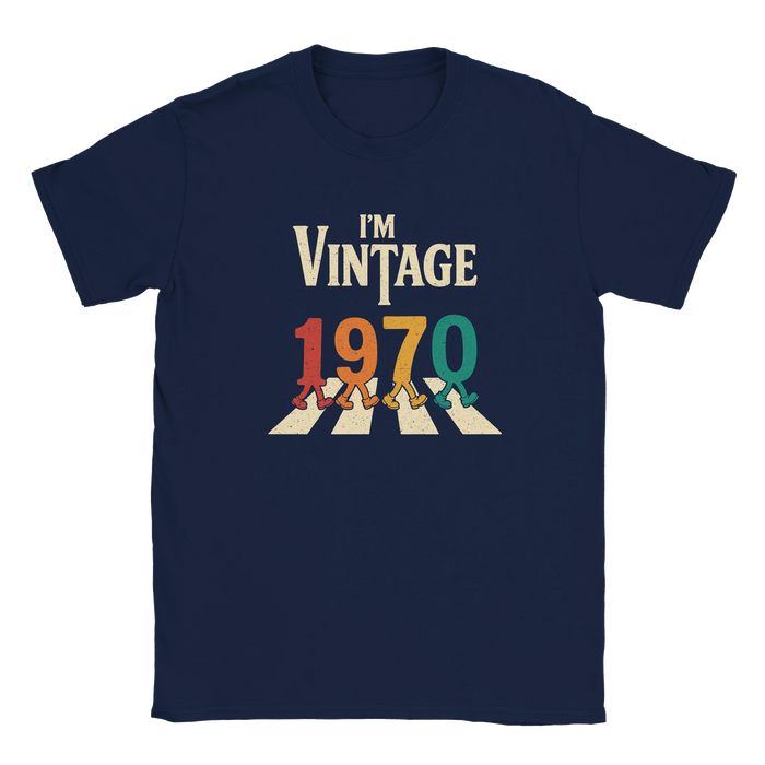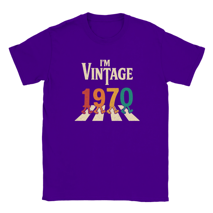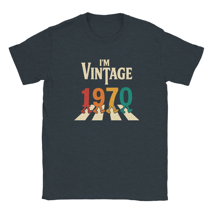 Celebra un hito especial con esta original camiseta vintage. Si naciste en 1970, esta es la forma perfecta de mostrar tu orgullo y sentido del humor. El diseño divertido, inspirado en la mítica portada de Abbey Road, combina el texto "I'm Vintage" con el año 1970. Es el regalo perfecto 55 cumpleaños para hombres y mujeres, ideal para añadir un toque retro y divertido a cualquier celebración. Confeccionada con algodón de alta calidad para asegurar comodidad y durabilidad. Disponible en varias tallas, esta camiseta es un detalle único que seguro encantará. Sorprende a esa persona especial con un regalo memorable que celebre su espíritu vintage.