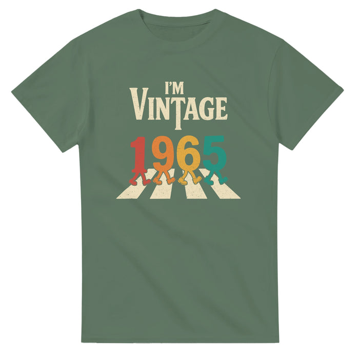 Celebra un hito especial con esta original camiseta vintage. Si naciste en 1965, esta es la forma perfecta de mostrar tu orgullo y sentido del humor. El diseño divertido, inspirado en la mítica portada de Abbey Road, combina el texto "I'm Vintage" con el año 1965. Es el regalo perfecto 60 cumpleaños para hombres y mujeres, ideal para añadir un toque retro y divertido a cualquier celebración. Confeccionada con algodón de alta calidad para asegurar comodidad y durabilidad. Disponible en varias tallas, esta camiseta es un detalle único que seguro encantará. Sorprende a esa persona especial con un regalo memorable que celebre su espíritu vintage.